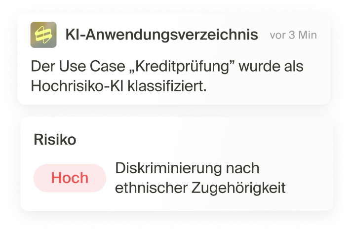 KI-Systeme und Use Cases identifizieren und dokumentieren Sie einfach in caralegal. Diese werden automatisch klassifiziert und der Anforderungskatalog abgeleitet. So werden regulatorische Anforderungen mühelos erfüllt.